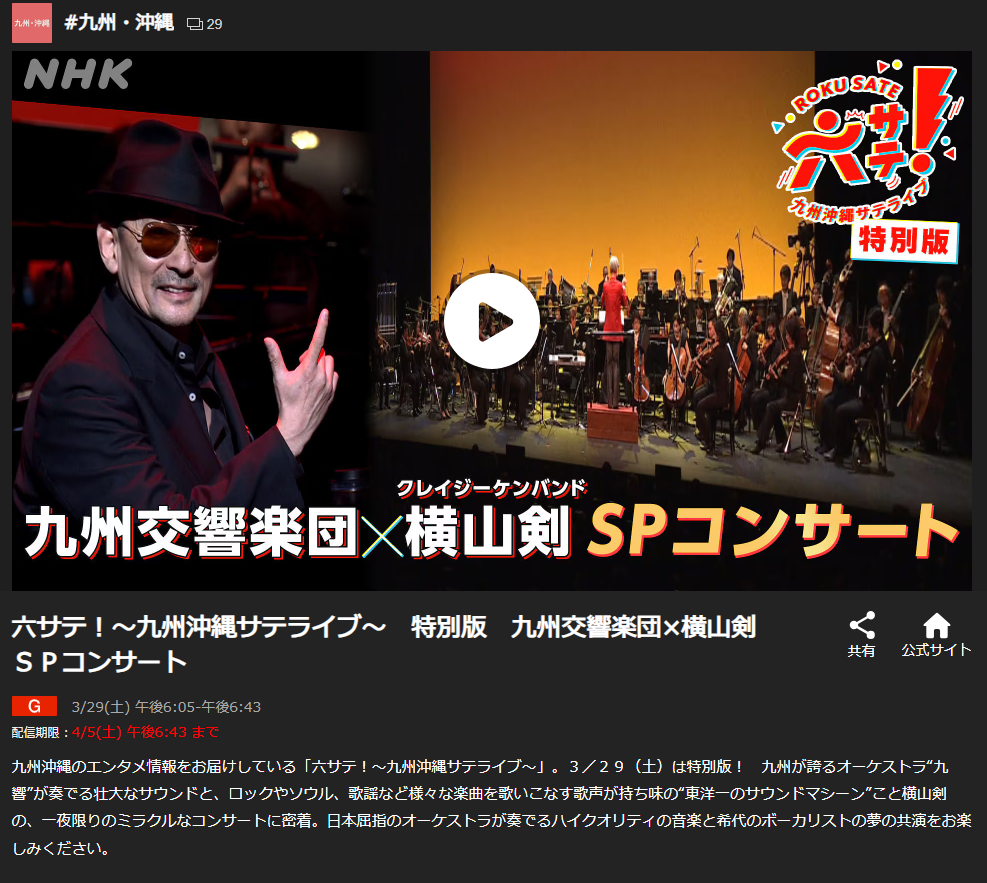 NHK 六サテ!~九州沖縄サテライブ~ 特別版 九州交響楽団×横山剣SPコンサートに出演【終了しました】